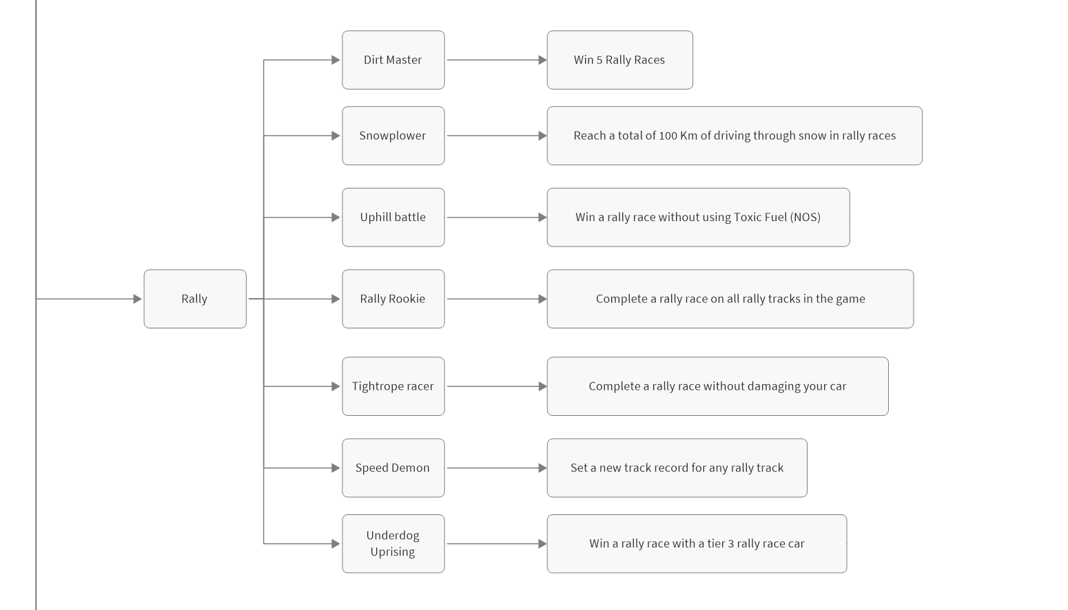 <figure><img src="https://2747565017-files.gitbook.io/~/files/v0/b/gitbook-x-prod.appspot.com/o/spaces%2F0ESOGrceR1mTf2c4bqxR%2Fuploads%2FPBMBToqPYSnyAtR4oq99%2FAchievements-Rally_Race.png?alt=media&#x26;token=2f4f89c7-e22d-4f36-857e-596b201e5483" alt=""><figcaption><p>Rally Race achievements.</p></figcaption></figure>